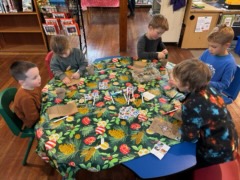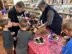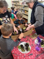 In the library, Grey Squirrel joined in the conversation by reading parts of the book "Frozen Wild" by Jim Arnosky, all about how animals survive in the coldest places on Earth. Thanks for reviewing all the actions for hibernation, migration and stay and adapt, Grey Squirrel! Do you remember the actions? We really liked your migration action! A second book called "Winter Lullaby" by Barbara Seuling, focused on where the animals go? We would also like to thank Grey Squirrel for helping us plant a succulent plant to take home. Thank you for giving us the instructions on how to care for our plant friend and helping it survive through the winter!