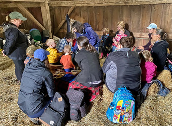 At Stoneridge Farm today, we shared and took turns playing and exploring. We look at a lot of things around us with our eyes. What could we feel and hear in the morning? The rain was so loud we could hardly talk to each other. We went up to the hayloft to explore and play while we waited for the heavy rain to ease up. What did your child like about the hayloft?