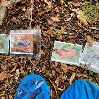 What is the difference between a predator and a prey animal? Which one needs to be more alert? In our afternoon activity, the fox group (Fox was sick today and we missed her leading the fox group) went on a hunt to find the group of mice. Which group was the predator and which group was the prey? Chalk blazes and pegs were used as signs by the prey for the predators to follow. We look forward to trying this activity again but switching up the groups to experience being hunter and hunted.
