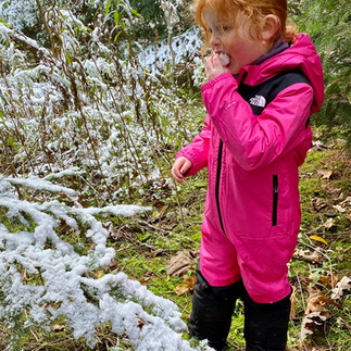 It is just like something out of a postcard here. We began by making a snow art piece with snowplow feet in a deer trail. What did we create and how did we sign our masterpiece? Falcon’s signature was HUGE with a fun leafy outline. No Halloween hangovers here, we all checked in with energy and happiness, especially with our two new friends along. Our morning song brought thankfulness for trees of course. See if you can get your child to sing this song and add what our group was thankful for today. When I rise……