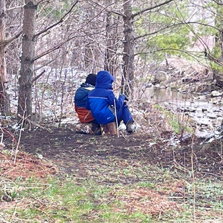 Can you imagine what the adults in your house would do if they had wander time? What would they have chosen to do today? Talk about the human-sized bird’s nest built using the dried plants brought down by the flood, the stone bridge across the stream, leafy squirrel drey, and tree climbing practice. One group discovered a large sheet of wood. What was it used for?