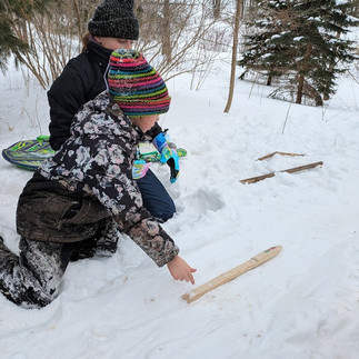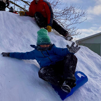 Zoom! Once we tamped down the snow, our sledding trail really took off. We used sleds to help clear a smooth path so our snow snakes could slide farther and faster down the hill.