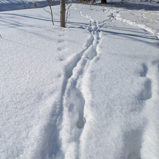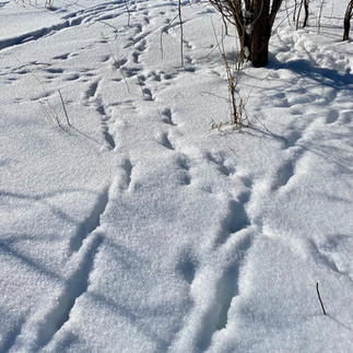 During our wander we journeyed to Pine Haven. Can you name so of the tracks that we notice along the way? In the photo on the left we can see where a deer spent the night. Do you think that a bed in the snow would be good to sleep in, or would it be a little bit chilly? Why do you think a deer might choose to rest here?