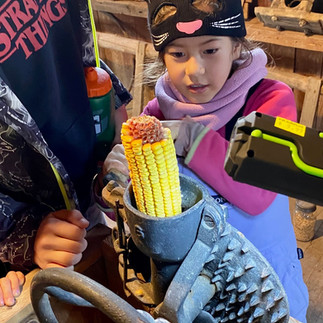 We got a chance to see the Mill through new eyes today as Mr. Miller (Tim) took us back through the heavy muscle work of pounding corn using stones, then hand crank grinders, and onward to water powered machines. Larch noted that really the force for powering the Mill is all gravity-driven. When kids get a chance to practice a tough task, they appreciate what it must've taken for people to make a simple loaf of corn bread. There were lots of excited shouts turning the handle of the corn husker, and then working the machines to get the mill belts moving again. Ask your child about how the Grist Mill worked when it was running. How did they move the grain through the building and use blades to turn this into flour? What happened to the Mill one hundred years ago?